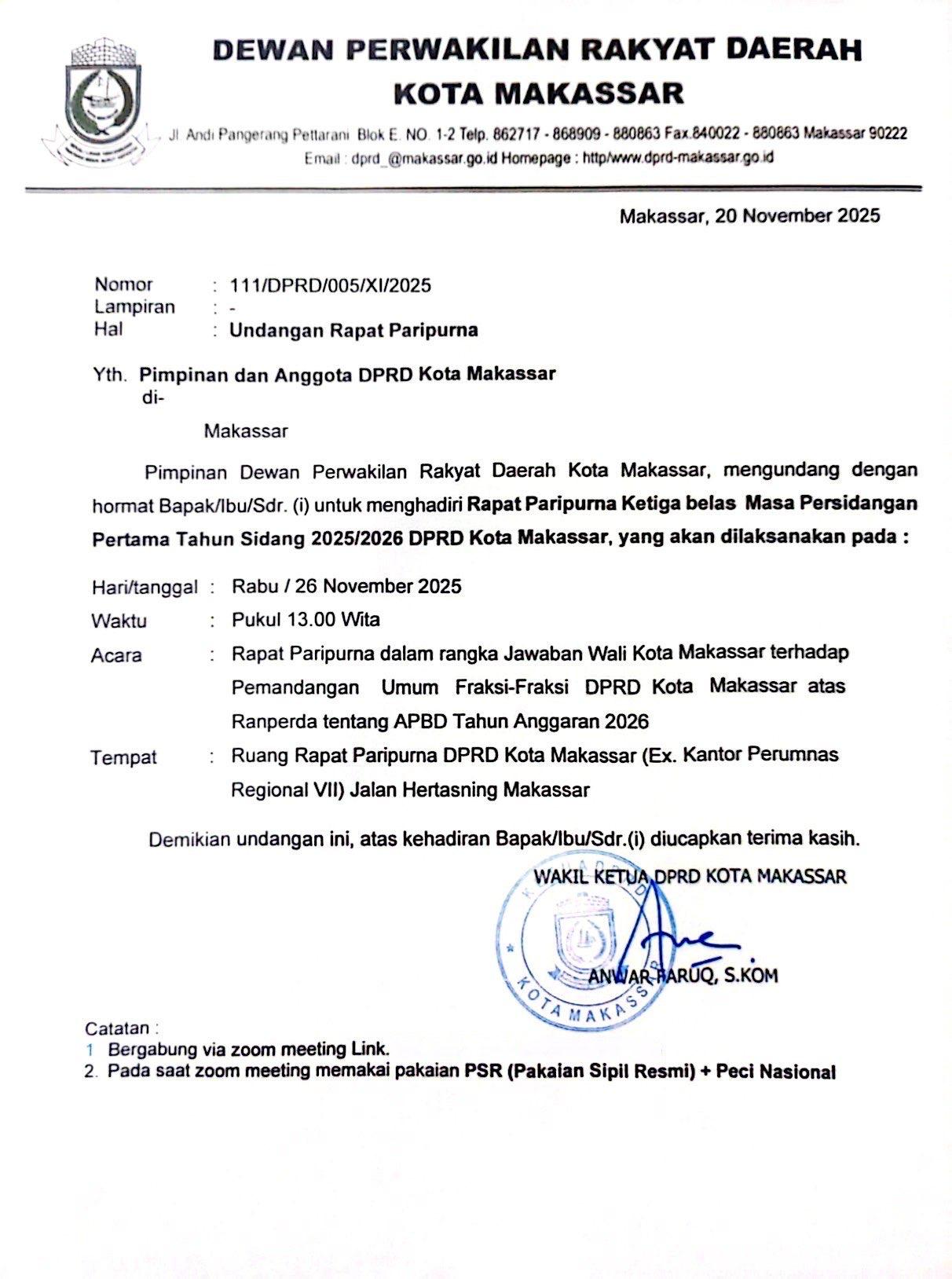 RAPAT PARIPURNA DALAM RANGKA JAWABAN WALI KOTA MAKASSAR TERHADAP PEMANDANGAN UMUM FRAKSI-FRAKSI DPRD KOTA MAKASSAR ATAS RANPERDA TENTANG APBD TAHUN ANGGARAN 2026